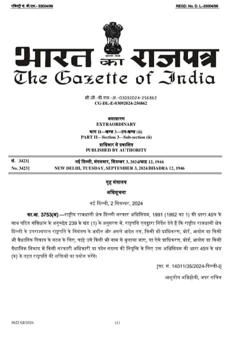 राष्ट्रपति द्वारा जारी गजट नोटिफिकेशन में कहा गया, “राष्ट्रीय राजधानी क्षेत्र दिल्ली शासन अधिनियम, 1991 (1992 का 1) की धारा 45डी के साथ पठित संविधान के अनुच्छेद 239 के खंड (1) के अनुसरण में, राष्ट्रपति एतद्द्वारा निर्देश देते हैं कि राष्ट्रीय राजधानी क्षेत्र दिल्ली के उपराज्यपाल, राष्ट्रपति के नियंत्रण के अधीन रहते हुए और अगले आदेश तक, किसी प्राधिकरण, बोर्ड, आयोग या किसी भी वैधानिक निकाय, चाहे उसे किसी भी नाम से पुकारा जाए, के गठन के लिए या ऐसे प्राधिकरण, बोर्ड, आयोग या किसी भी वैधानिक निकाय में किसी सरकारी अधिकारी या पदेन सदस्य की नियुक्ति के लिए उक्त अधिनियम की धारा 45डी के खंड (ए) के तहत राष्ट्रपति की शक्तियों का प्रयोग करेंगे।”